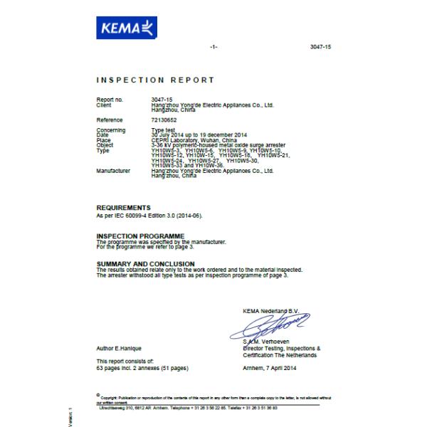YongDe metal oxide surge arrester have KEMA Type Test Report!
